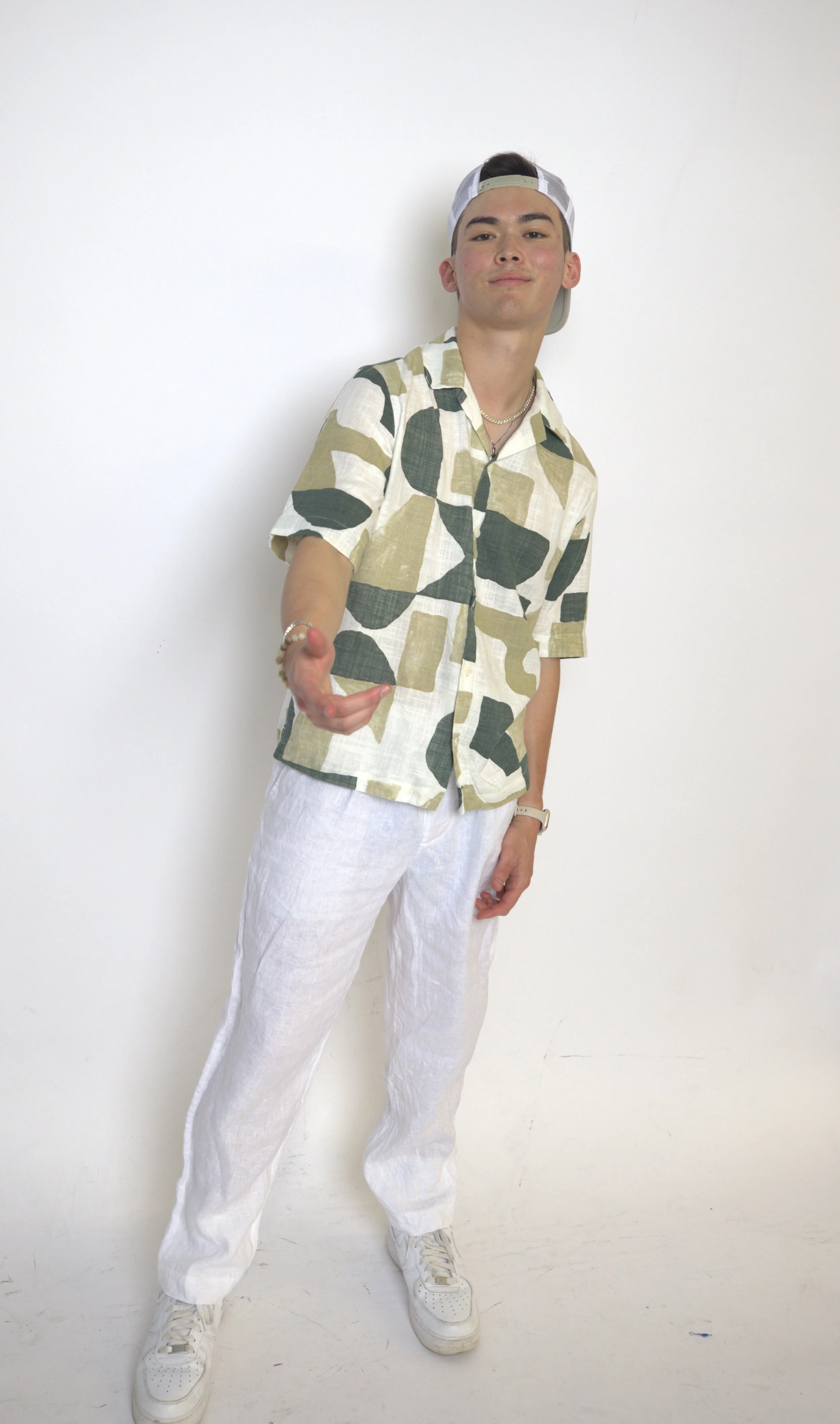 A young man with dark hair, wearing sunglasses, a white cap, a white shirt, several layered necklaces, and a smartwatch, appears to be listening to music with earphones at an outdoor event.