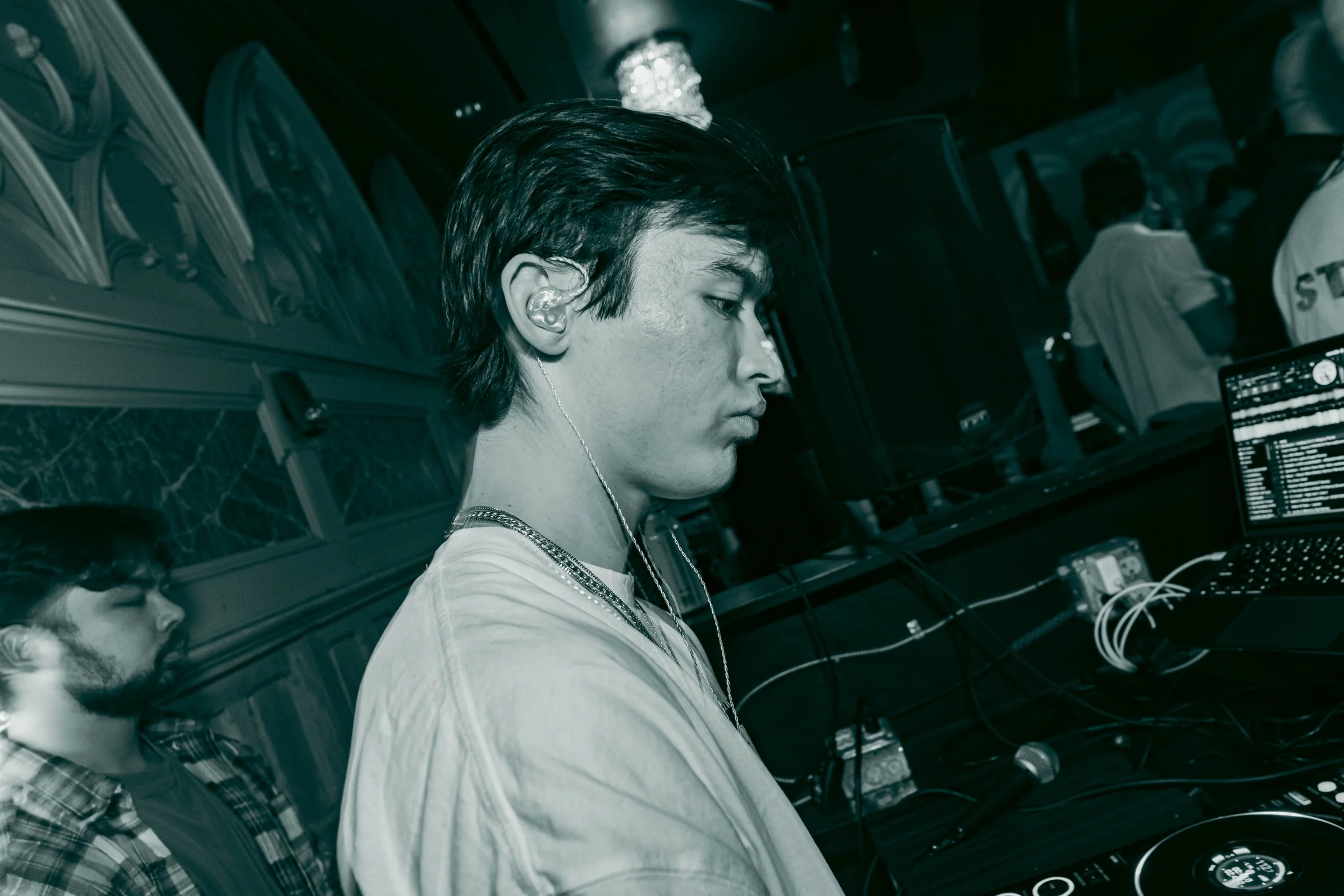 A young DJ with dark hair, wearing a white t-shirt and jewelry, DJing at a club with equipment, a laptop, and a fan behind him. There is a neon sign with text in the background and another person with a shaved head and light-colored shirt nearby. The